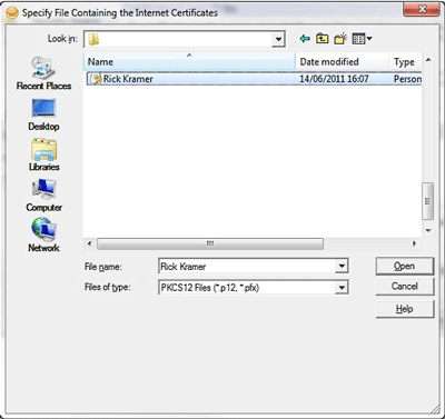 Now "Specify file…" window will pop up. Locate the PKCS#12 certificates that you want to install and click on Open Button.