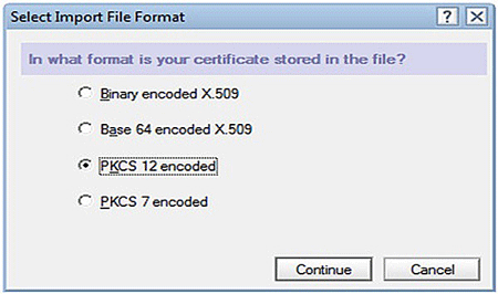 Now a dialog box will prompt to ask you the file format of Certificates stored in. choose PKCS#12 Encoded and then click on Continue to precede furthur.